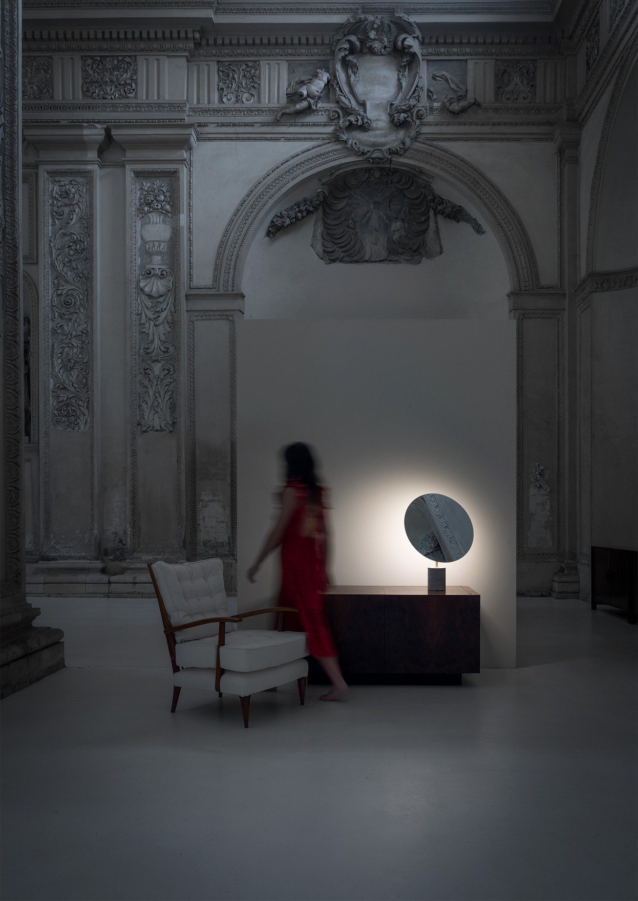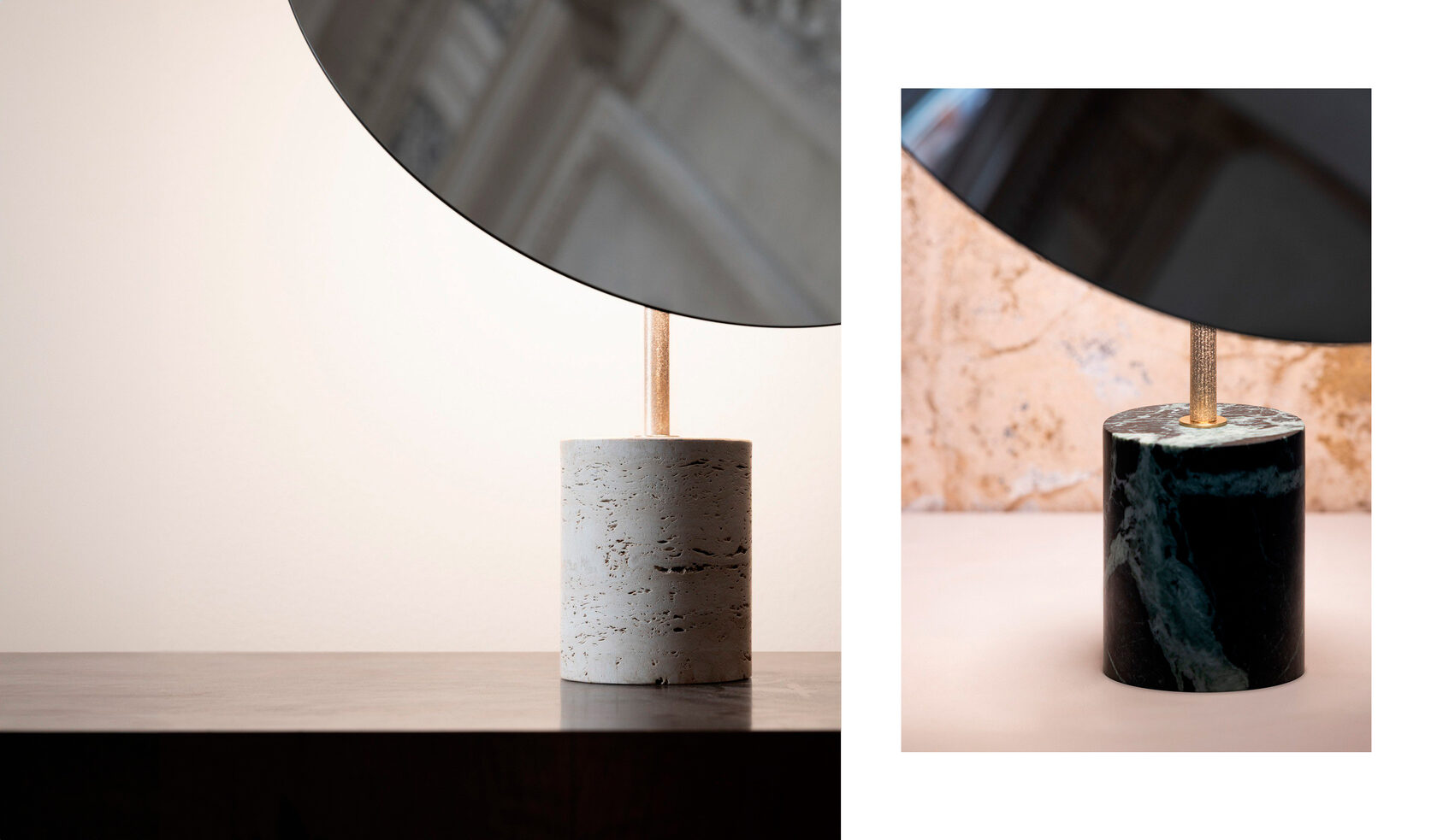 Обновленный настольный торшер от Davide Groppi с основаниями из травертина или зеленого мрамора — магия на вашем столе.